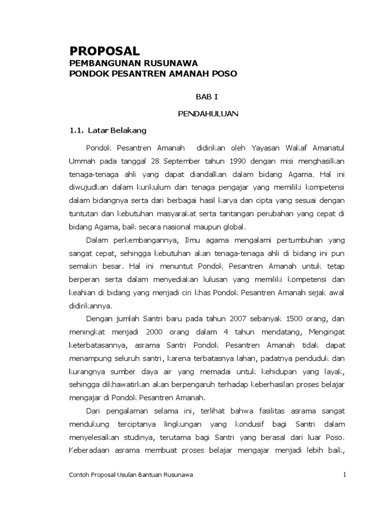 Proposal Permohonan Bantuan Dana Pembangunan Asrama Pondok Pesantren Sirojul Huda Mekar Jati Rt 05 Pdf Document. Proposal Permohonan Bantuan Pembangunan Asrama Pondok Pesantren Pada prinsipnya pendidikan Islam selain berfungsi sebagai transformasi ilmu-ilmu ke-islaman dan ilmu pengetahuan umum modern sebagai bekal hidup di dunia dan akhirat juga berfungsi sebagai pemelihara dan pembimbing jiwa kefitrohan anak menuju jiwa ketauhidan yang nantinya melahirkan ketundukan. LATAR BELAKANG Seiring dengan kemajuan ilmu pengetahuan dan teknologi yang sangat pesat telah mendorong tumbuh dan berkembangnya lembaga pendidikan yang beragam dari berbagai jenis keahlian dan jenjang keilmuan.