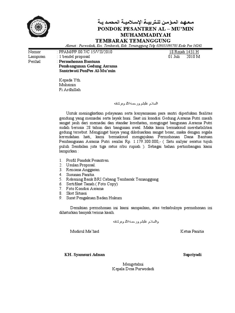 Akhir kata kami ucapkan terimakasih atas bantuan yang diberikan kepada kami semoga Allah SWT menerima dan meridloi segala amal ibadah kita semua. Contoh Surat Permohonan Bantuan Dana Pembangunan Pondok Pesantren Berbagi Contoh Surat. PROPOSAL PROGRAM PEMBANGUNAN ASRAMA SANTRI PONDOK PESANTREN AL FALAH DAGO BANDUNG BAB I PENDAHULUAN A.