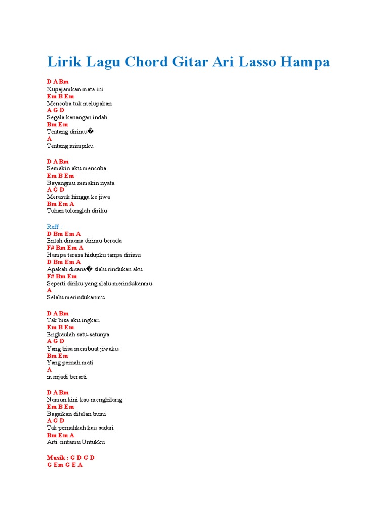 Chord Gitar Hampa - Ari Lasso. Tentang dirimu A Tentang mimpiku D A Bm Semakin aku mencoba Em B Em Bayangmu semakin nyata A G D Merasuk hingga ke jiwa Bm Em A Tuhan tolonglah diriku Reffrain. Hampa terasa hidupku tanpa dirimu.